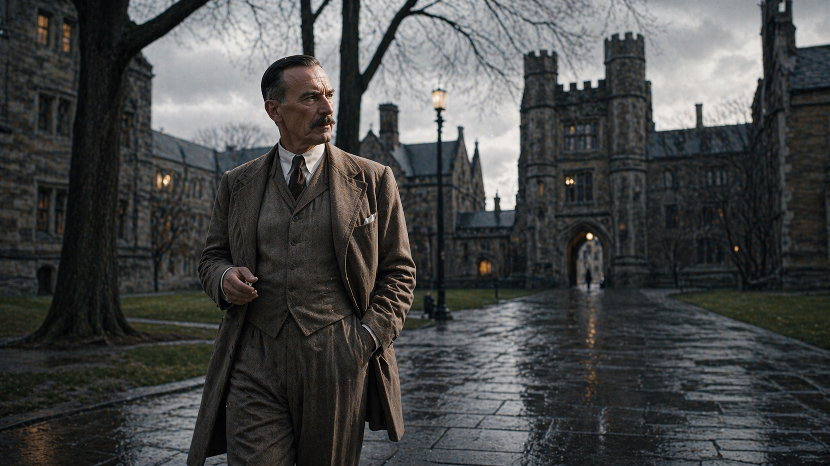 He does not smile. He rarely smiles. But there is something in his expression that is not quite irony and not quite warmth and might, in the right light, be the thing that survives when both of those have been tested past their limits.