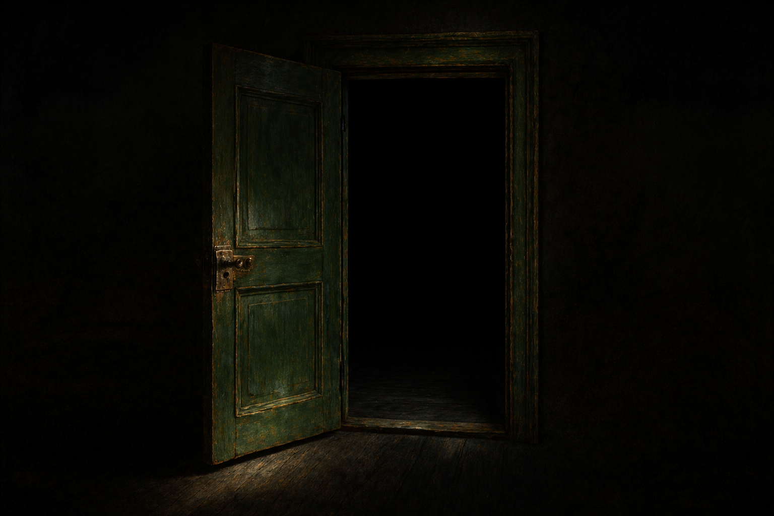 I do not know why I see it. I do not ask. The door is green. It has brass at the latch. The latch is the cold kind. The cold kind makes your hand hurt in winter and you hold it to your coat.