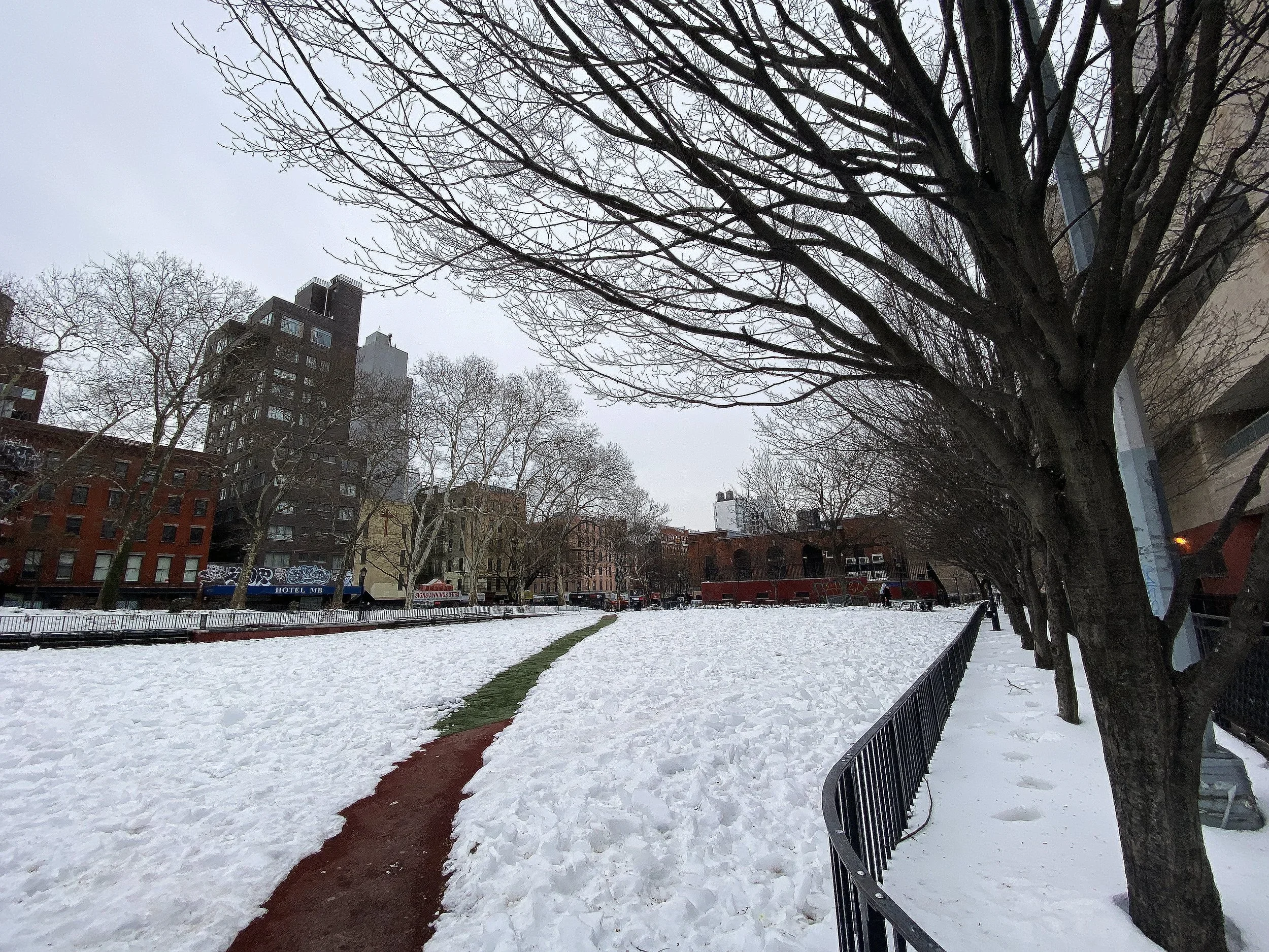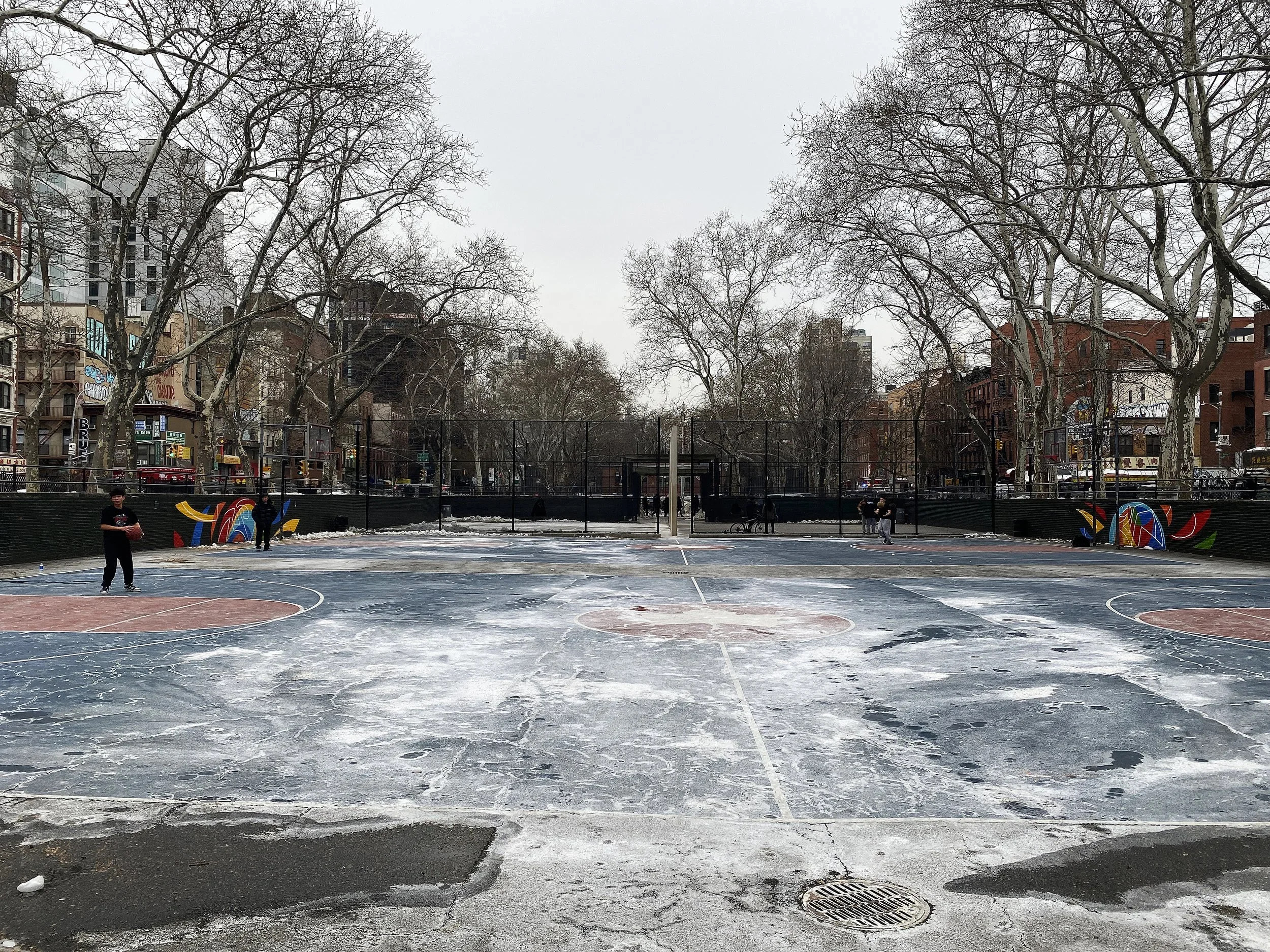 Sara D. Roosevelt Park is the long strip of green running between Chrystie and Forsyth from roughly Houston down to Canal. It exists because an entire band of tenements was cleared in the 1930s to create open space in one of the most overcrowded immigrant districts in the city. So this park is literally an absence. A missing swathe of buildings turned into a path. A good stand-in for pilgrimage, for spaces where communities try to make something more humane out of over-compression.
