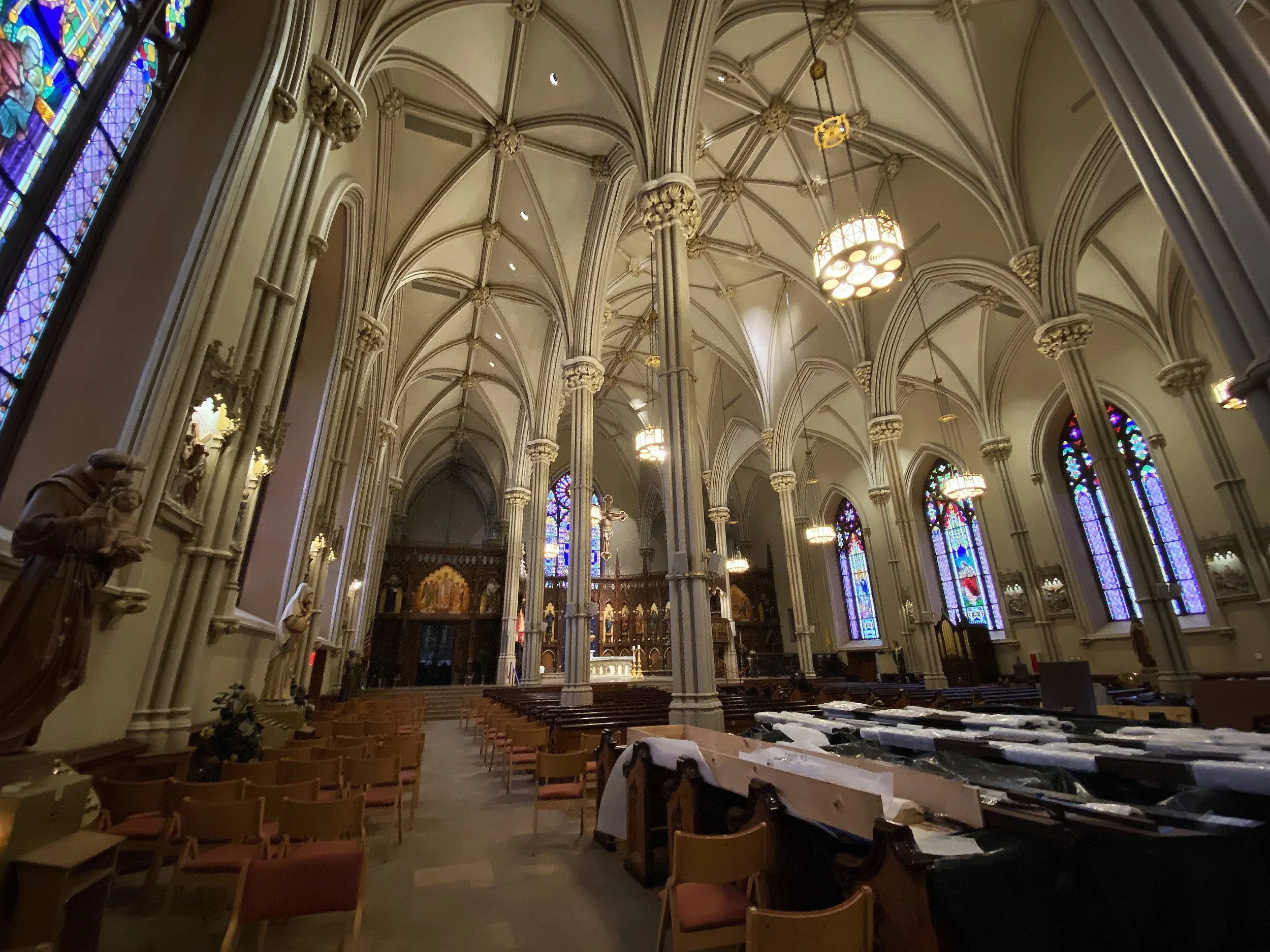As we come up Mott St and see the brick wall and gates, don’t start the music yet. Let the shift in architecture do some of the work. From glass storefronts to Gothic Revival stone and iron, from street vendors to a graveyard.