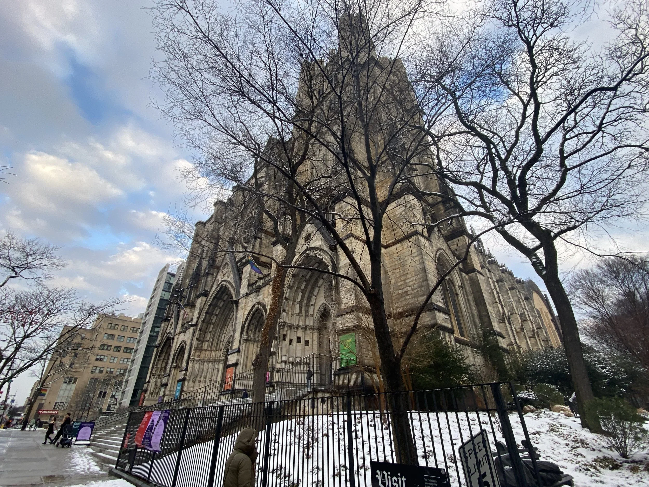 Turn north on Amsterdam and walk toward the cathedral at 112th Street. The main facade will come into view ahead of you, slightly elevated, at the end of the avenue's perspective.