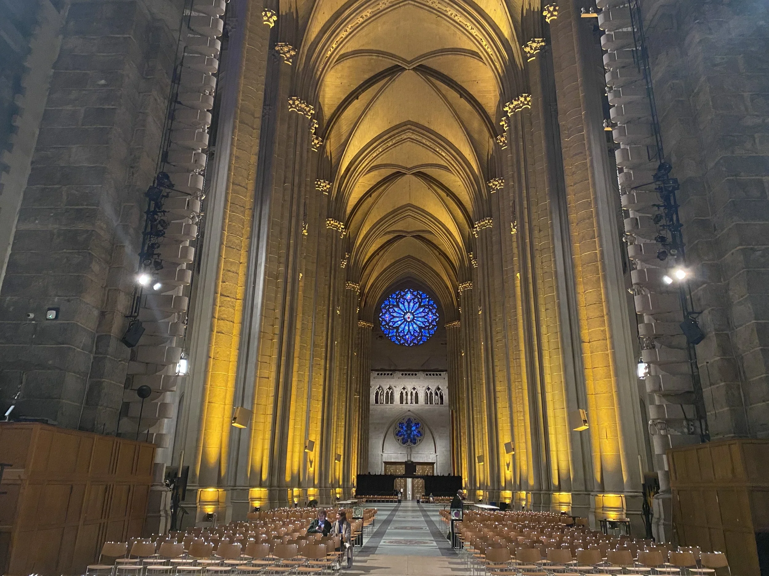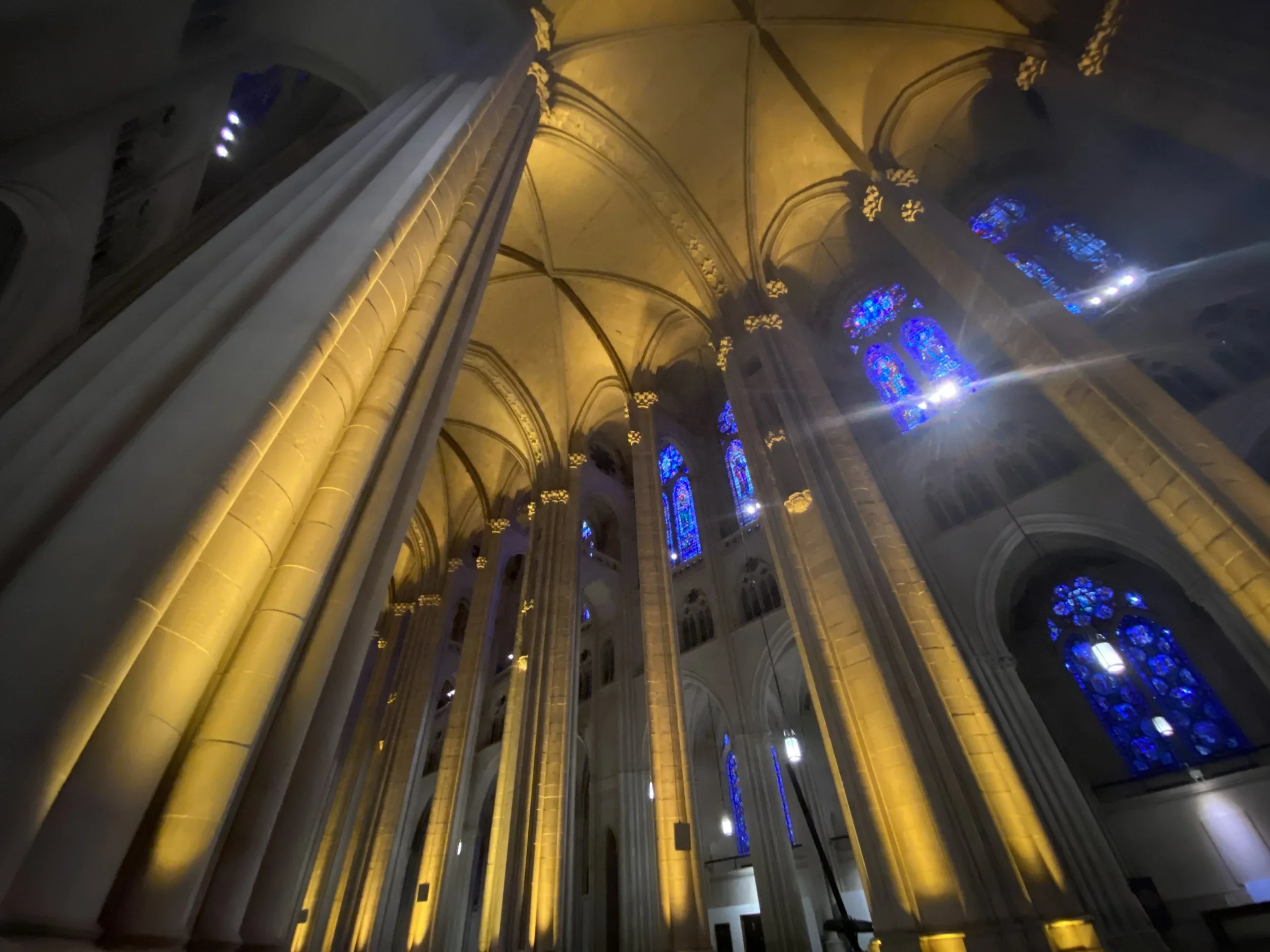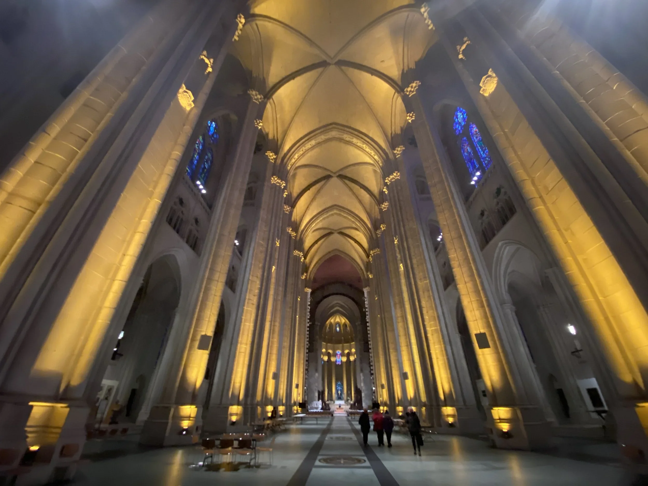 The proportions are extraordinary. 601 feet from entrance to apse, the nave ceiling 124 feet above the floor, the light entering from the clerestory windows in that specific filtered quality that Gothic architects understood. Not illuminating but revealing, light that shows the stone rather than defeating it.